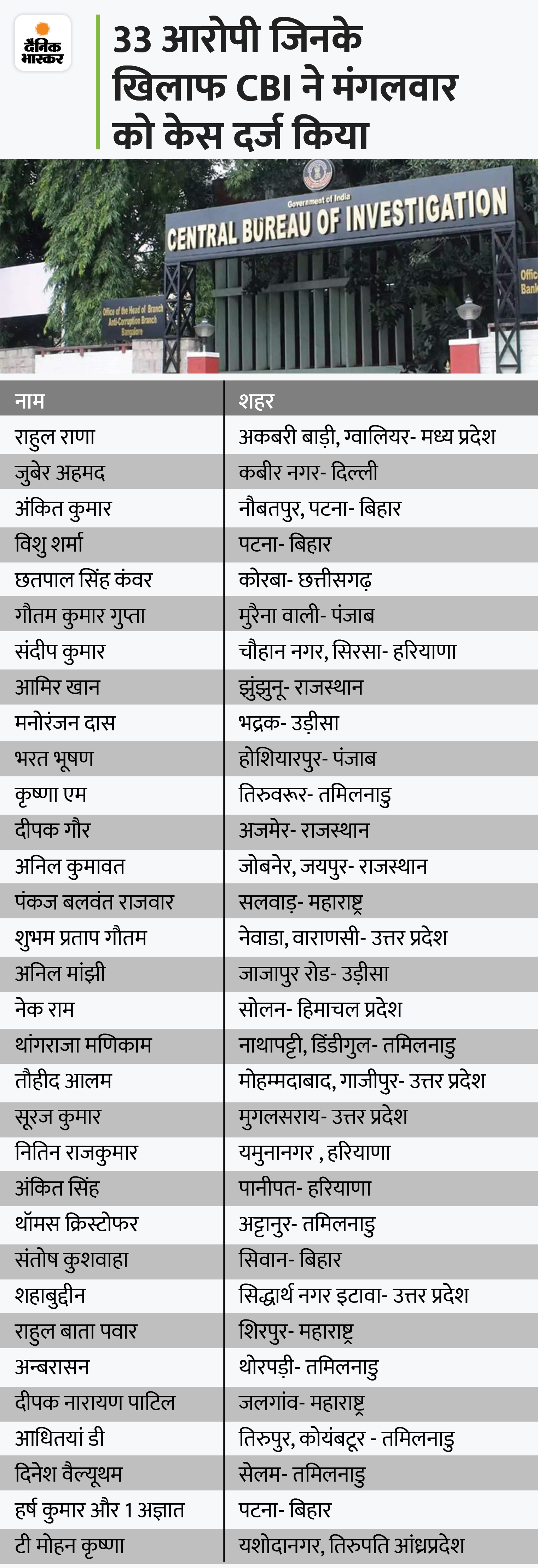 14 नवंबर को इस मामले में 83 आरोपियों के खिलाफ 23 नामजद मुकदमे दर्ज किए गए थे। CBI ने मंगलवार को 33 आरोपियों के खिलाफ केस दर्ज किया, जिसमें तमिलनाडु के 6, बिहार के 5, UP के 4 , राजस्थान- महाराष्ट्र-हरियाणा के 3, ओडिशा-पंजाब के 2 , आंध्र प्रदेश-छत्तीसगढ़- दिल्ली- MP और हिमाचल प्रदेश से 1 शख्स शामिल है।