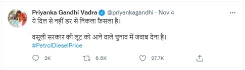 प्रियंका गांधी ने ट्विटर पर लिखा है कि, ‘ये दिल से नहीं डर से निकला फैसला है. वसूली सरकार की लूट को आने वाले चुनाव में जवाब देना है’. उनके ट्वीट पर सत्ता पक्ष और विपक्ष के समर्थक खुलकर एक दूसरे के सामने आ गए. प्रियंका से पहले बुधवार को समाजवादी पार्टी के प्रवक्ता डॉ. अनुराग भदौरिया (Anurag Bhadauria) ने गुरुवार को मोदी सरकार और योगी सरकार के पेट्रोल और डीजल पर टैक्स घटाने पर कटाक्ष किया था.